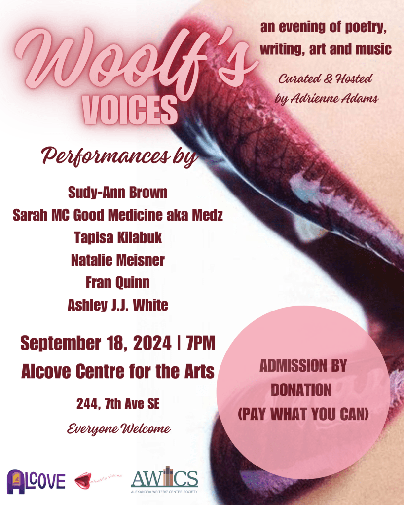 We are so happy to bring you Woolf’s Voices 35, September 18th at 7pm at The Alcove Centre for The Arts 244 7 Avenue Southwest, Calgary, AB, T2P 0W6Canada (map)sponsored by The Alexandra Writer’s Center