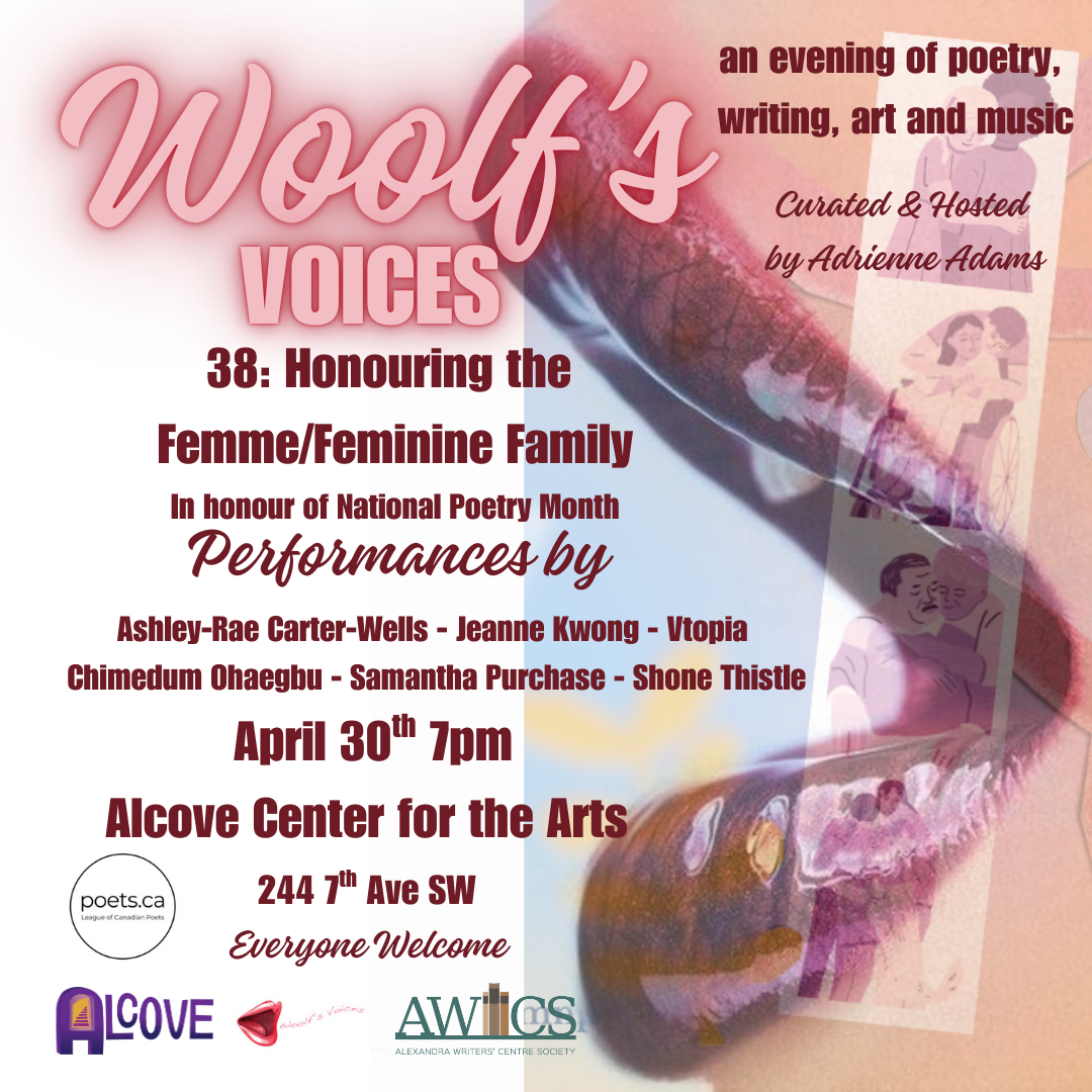 Join us for a special edition of Woolf’s Voices 38 – Honouring our Femme/Feminine Family April 30th 7pm at 244 7th Ave SW The Alcove Centre for the Arts. Sponsored by the League of Canadian Poets and The Alexandra Writer’s Center. Register for Free Here!