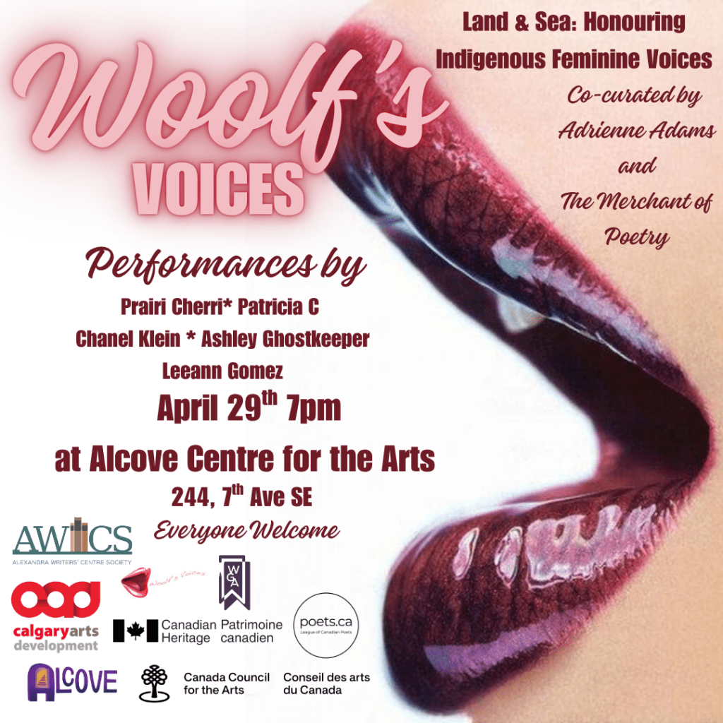 Join us for our Woolf’s Voices 42 on April 29th, 7pm at Alcove Center for the Arts, 244 7 Avenue Southwest, Calgary, AB, T2P 0W6. This event is co-curated by Adrienne Adams and Tyler the Merchant, and Hosted By Tyler the Merchant of Poetry, and sponsored by The League of Canadian Poets, The Alexandra Writers’ Center, Canada Council for the Arts and Department of Canadian Heritage, and The Writers’ Guild of Alberta.